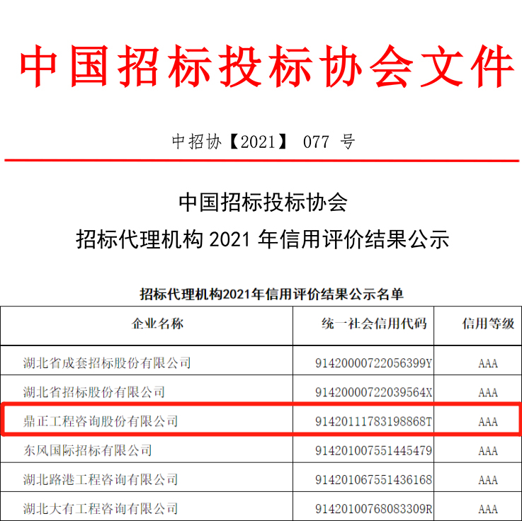 近日,中國(guó)招標(biāo)投標(biāo)協(xié)會(huì)頒布了招標(biāo)代理機(jī)構(gòu)2021年信用評(píng)價(jià)結(jié)果公示,鼎正工程咨詢股份有限公司繼獲得2021年度工程造價(jià)咨詢企業(yè)AAA信用評(píng)級(jí)后,再榮獲招標(biāo)代理機(jī)構(gòu)AAA信用評(píng)級(jí)!