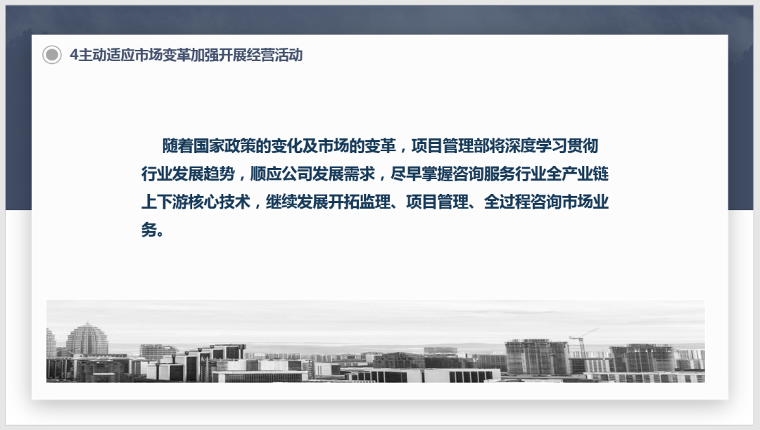 2、項目管理事業(yè)部:及時總結已完及在建全過程工程咨詢項目管理經驗,緊跟公司發(fā)展戰(zhàn)略定位,不斷提高工程咨詢全產業(yè)鏈上下游核心技術水平,積極發(fā)展開拓工程監(jiān)理、項目管理、全過程工程咨詢業(yè)務。