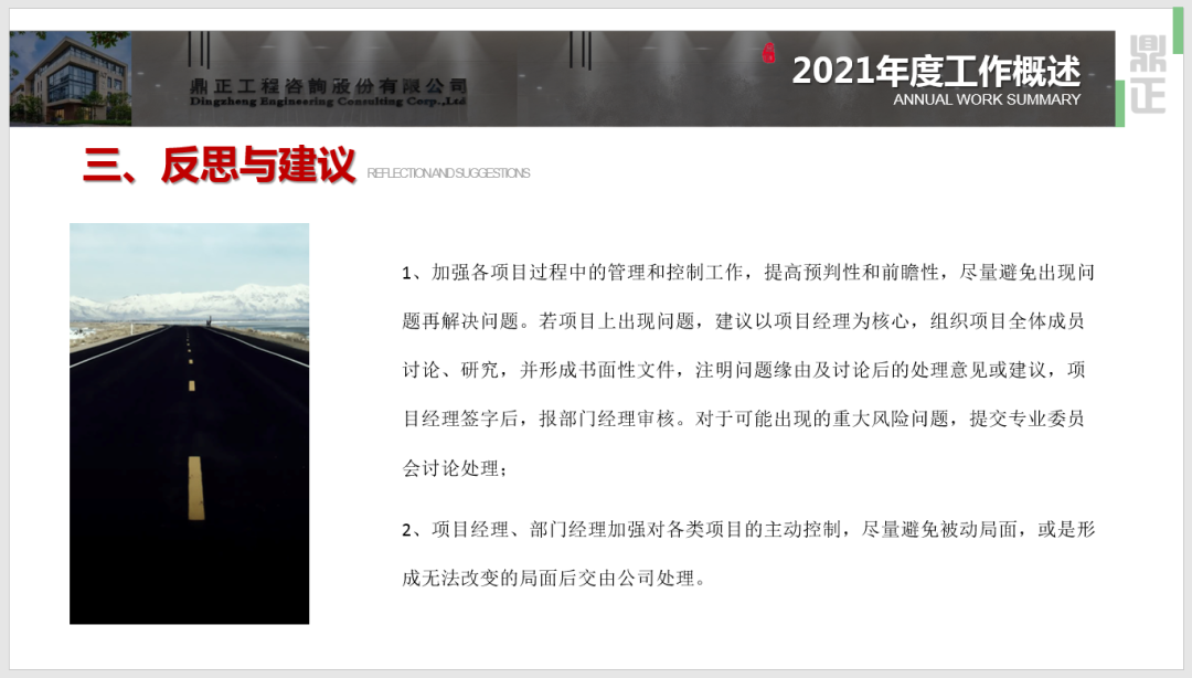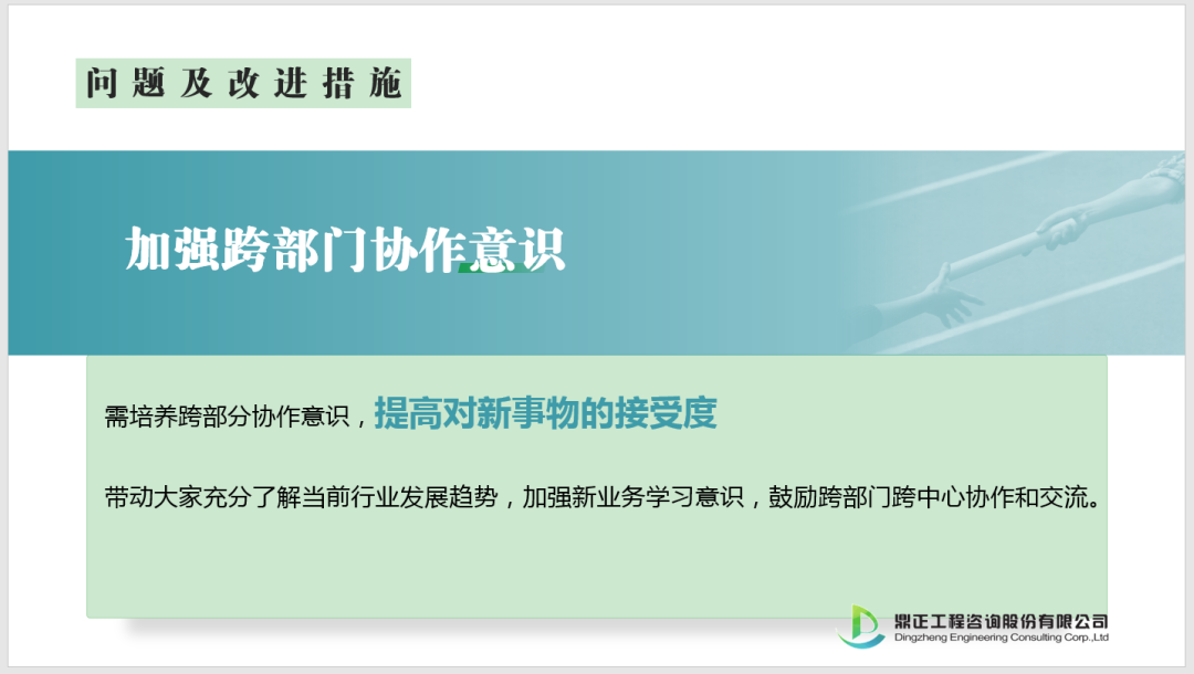 1、工程咨詢事業(yè)部:持續(xù)保持積極向上的態(tài)度,從人才儲備、資質資信、技術沉淀、經驗積累等方面做了大量工作,為部門“十四五”發(fā)展做了充足的準備。