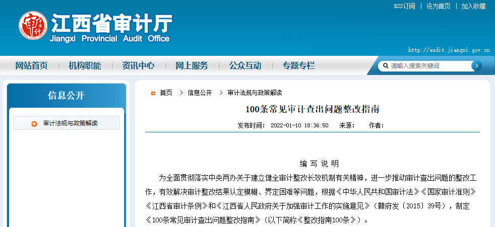 為進一步推動審計查出問題整改工作,加強對審計整改結果認定的指導,江西省審計廳印發(fā)了《100條常見審計查出問題整改指南》(以下簡稱《整改指南100條》)?!墩闹改?00條》按照常見的重大政策措施落實、預算管理、政府采購及招投標、基本建設、內控管理、企業(yè)管理、自然資源、社保資金及安居工程、金融管理、國外貸援款共10類審計內容進行問題分類,列舉了100個常見問題并給出相對應的整改方法說明,供審計機關和整改責任單位在審計整改工作中參照落實。整改特色亮點一是突出落實被審計單位整改主體責任;二是突出健全完善長效機制;三是突出問題分類整改。