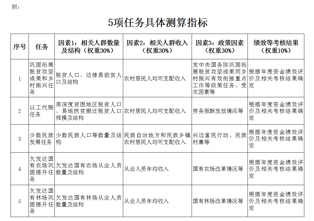 第二條 銜接資金按照鞏固拓展脫貧攻堅成果和鄉(xiāng)村振興、以工代賑、少數(shù)民族發(fā)展、欠發(fā)達國有農場鞏固提升、欠發(fā)達國有林場鞏固提升、“三西”農業(yè)建設任務進行分配。資金分配按照因素法進行測算,因素和權重為:相關人群數(shù)量及結構30%、相關人群收入30%、政策因素30%、績效等考核結果10%,并進行綜合平衡。各項任務按照上述因素分別確定具體測算指標(詳見附件)?!叭鳌鞭r業(yè)建設任務按照國務院批準的規(guī)模安排。