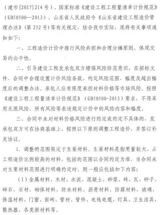 2018年1月30日,濟南市住建委印發(fā)《關(guān)于加強工程建設(shè)材料價格風(fēng)險控制有關(guān)事項的通知》(濟建標(biāo)字〔2018〕2號),明確工程計價中應(yīng)推行風(fēng)險共擔(dān)和合理分?jǐn)傇瓌t,承包人應(yīng)有限度承擔(dān)材料價格等市場風(fēng)險。