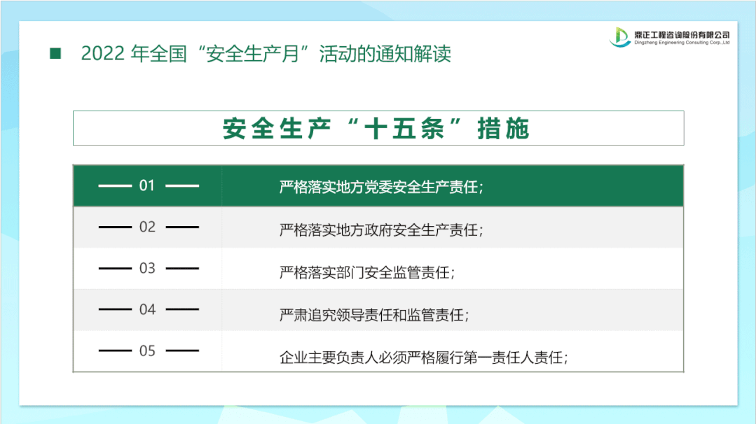 2022年全國“安全生產(chǎn)月”重點(diǎn)工作要求,1.深入學(xué)習(xí)貫徹習(xí)近平總書記關(guān)于安全生產(chǎn)重要論述,推動落實(shí)安全生產(chǎn)十五條措施;2.宣傳貫徹安全生產(chǎn)法,推動“第一責(zé)任人”守法履責(zé);3.持續(xù)開展“安全生產(chǎn)萬里行”活動,分類強(qiáng)化警示教育;4.廣泛開展“安全宣傳咨詢?nèi)铡焙桶踩麄鳌拔暹M(jìn)”活動,提升社會公眾安全意識和自救互救能力。