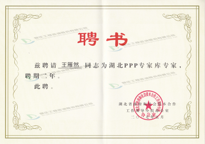 近日,湖北省政府和社會資本合作工作領(lǐng)導(dǎo)小組辦公室授予鼎正公司董事長王雁然先生、副總經(jīng)理兼技術(shù)總監(jiān)朱立冬教授為湖北省PPP專家?guī)鞂<摇4饲?/SPAN>,我司王雁然先生、朱立冬教授、張宏亮先生已入選湖北省財政廳PPP專家?guī)鞂<?,另外,王雁然先生還被崇陽縣人民政府聘為崇陽縣PPP項目專家顧問。
